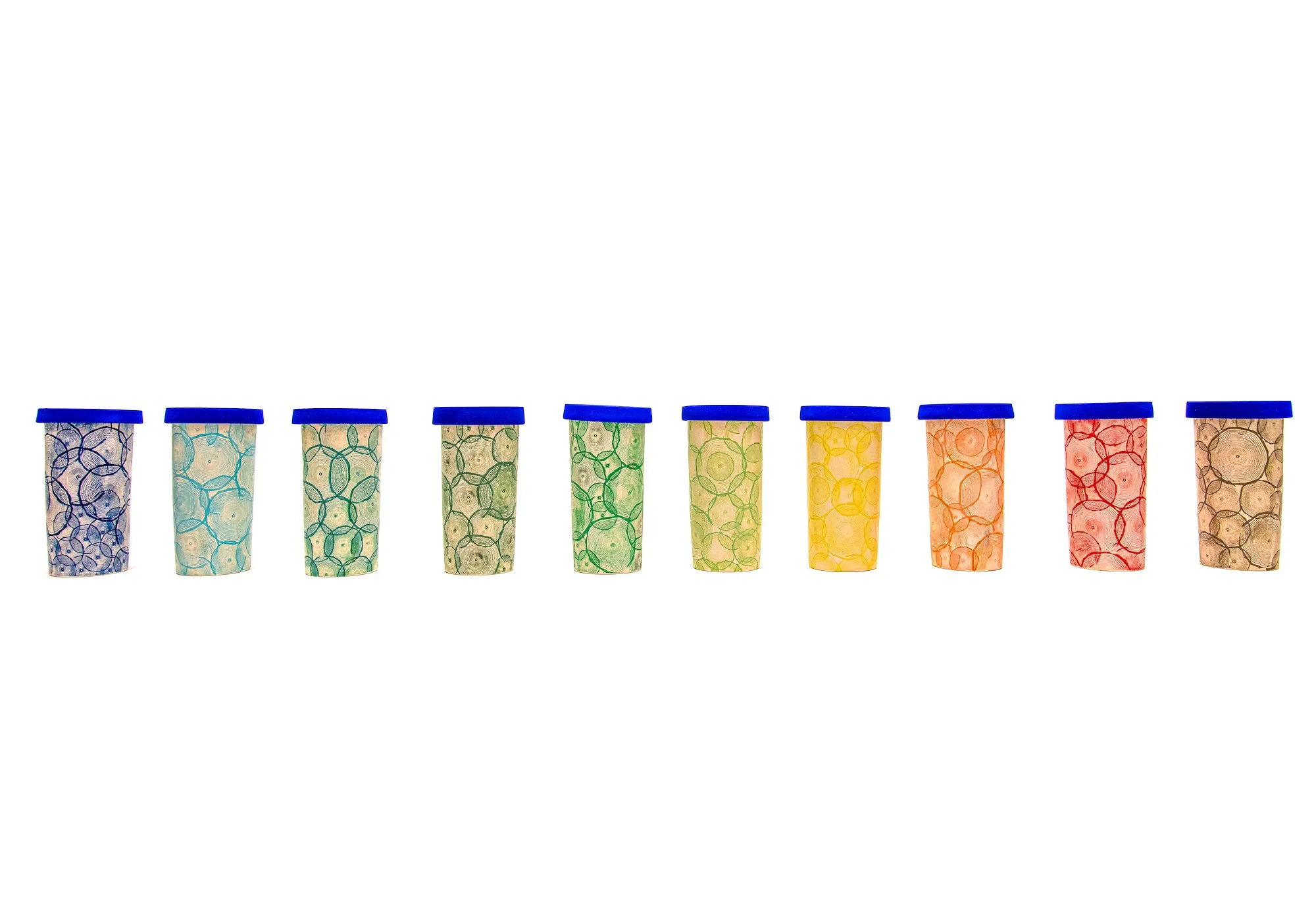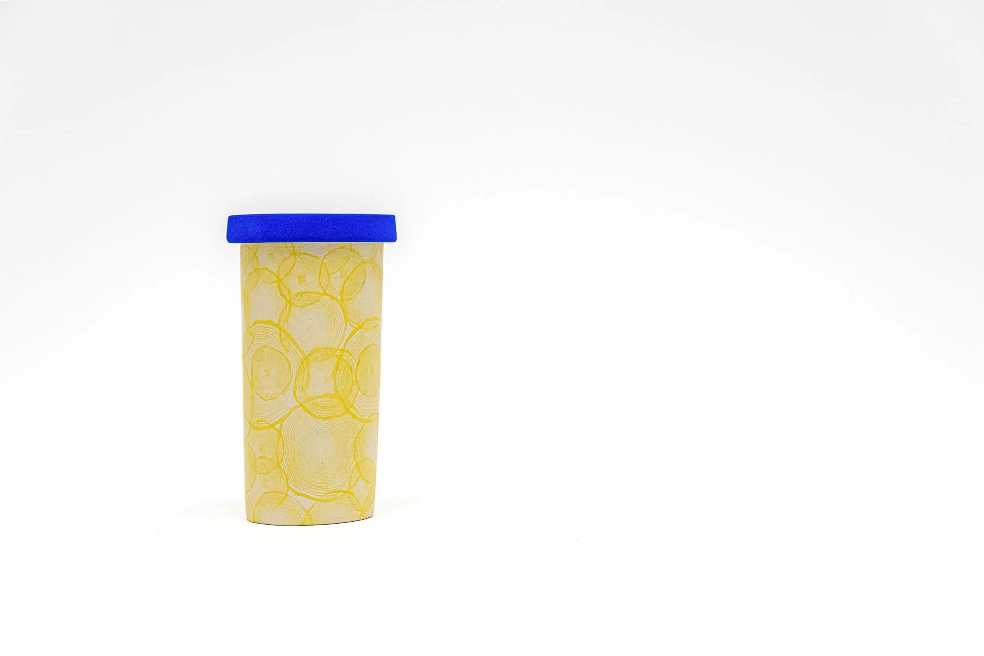 There are ten different variations of coloured vases and they are produced as an open edition. There are two sizes of vase, small and large. A cold wax finish makes the surface of each vase very smooth resulting in a pleasant tactile experience. Top blue cover is delicate, so as to not alter its brightness it was applied without top coat as this special pigment is intended for this purpose. It is possible to handle it, but with care.