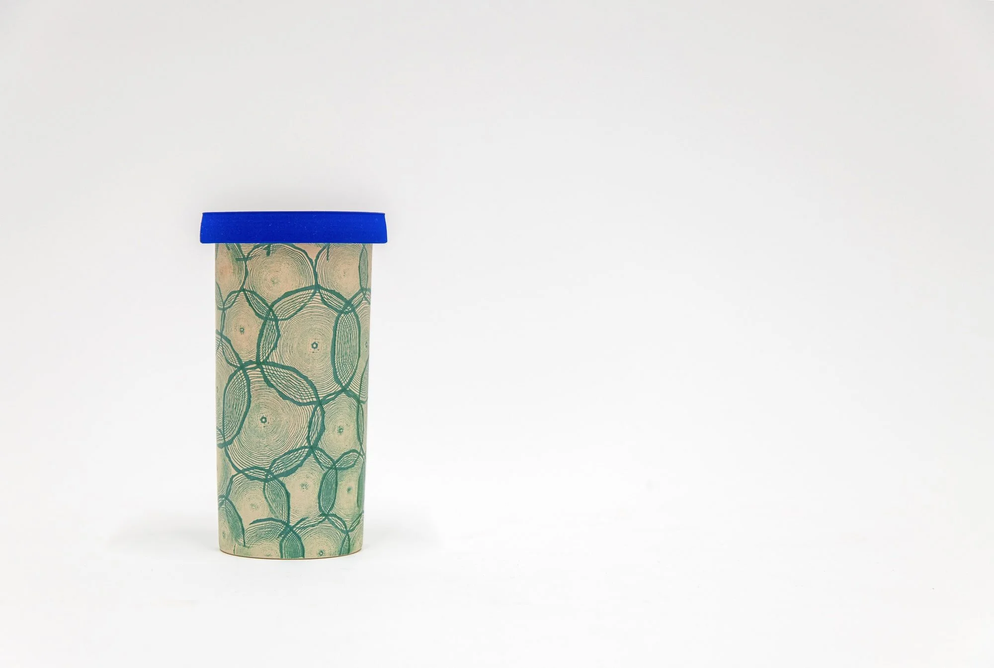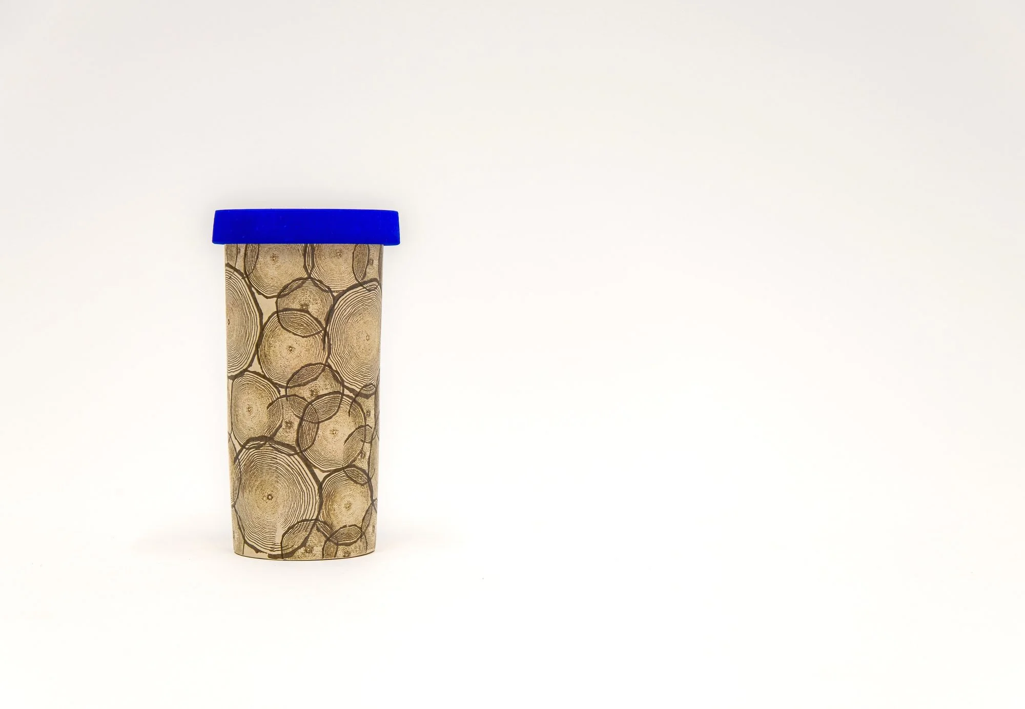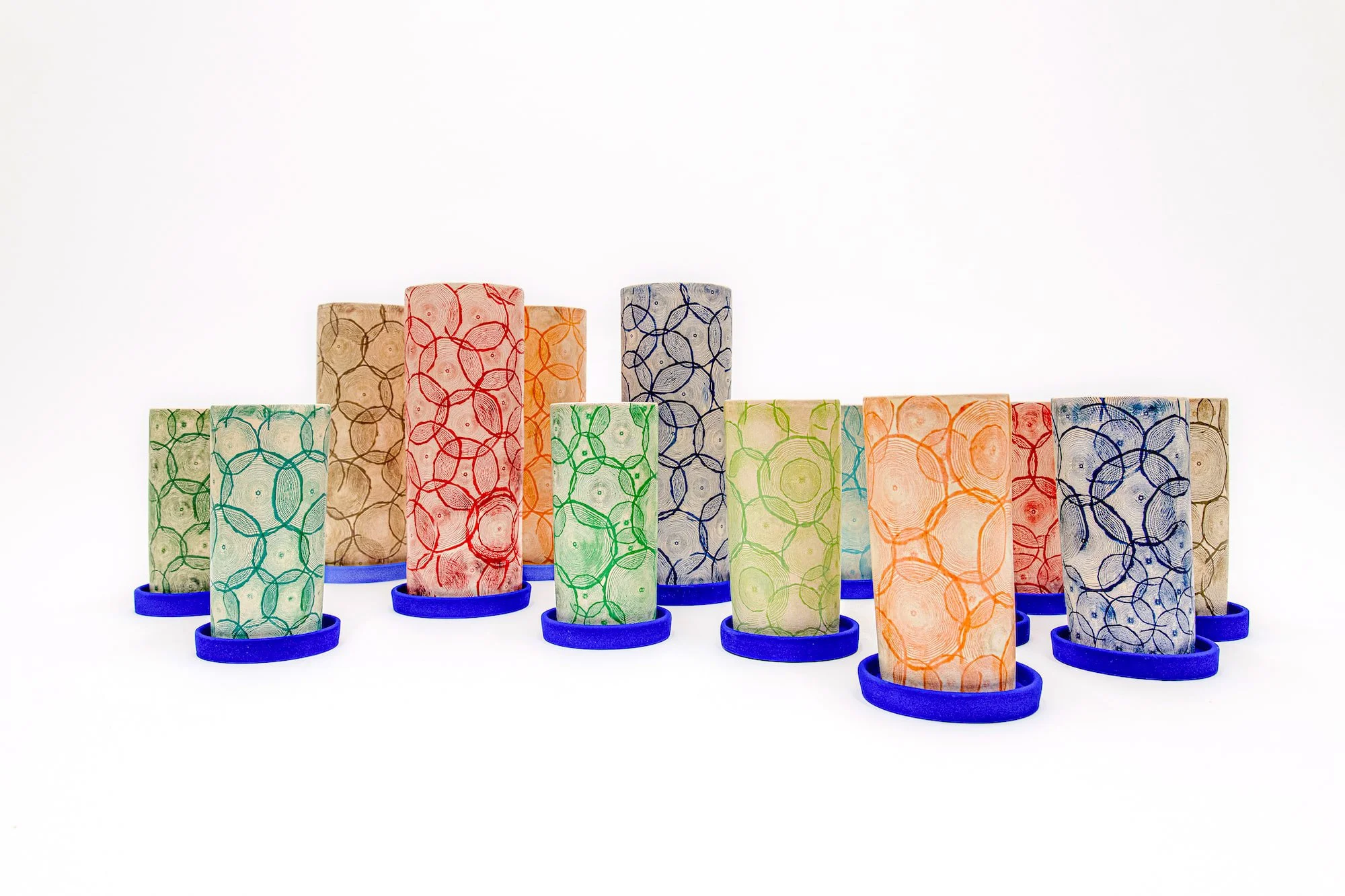 These cylindrical shaped vases - recalling tree trunks - is made up of an array of stamped tree ring patterns accumulated on its surface.