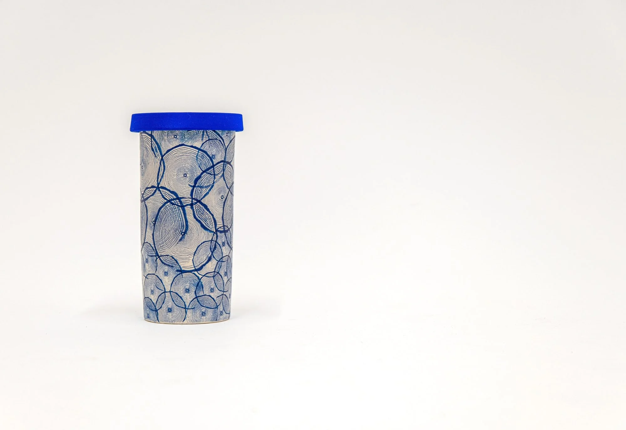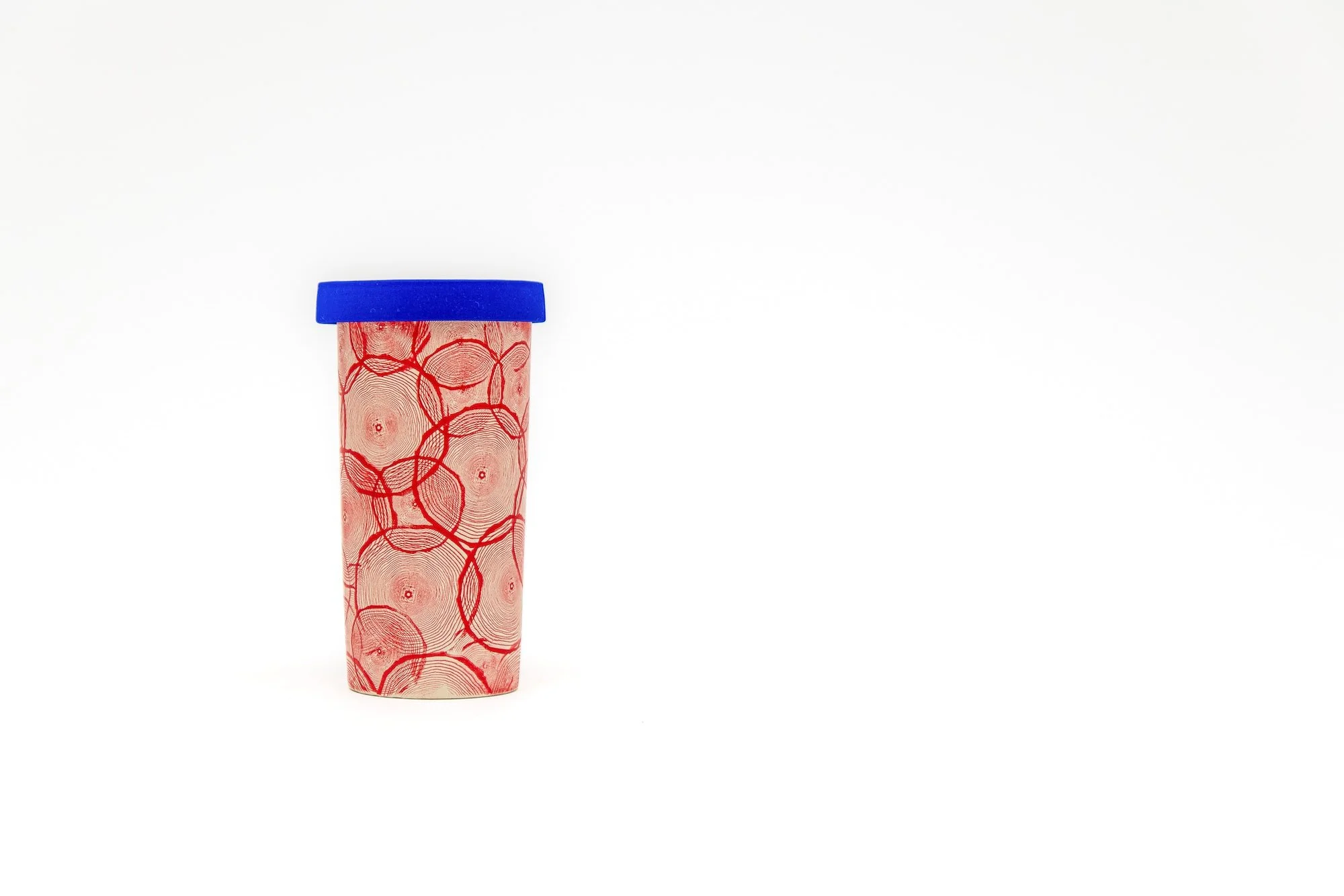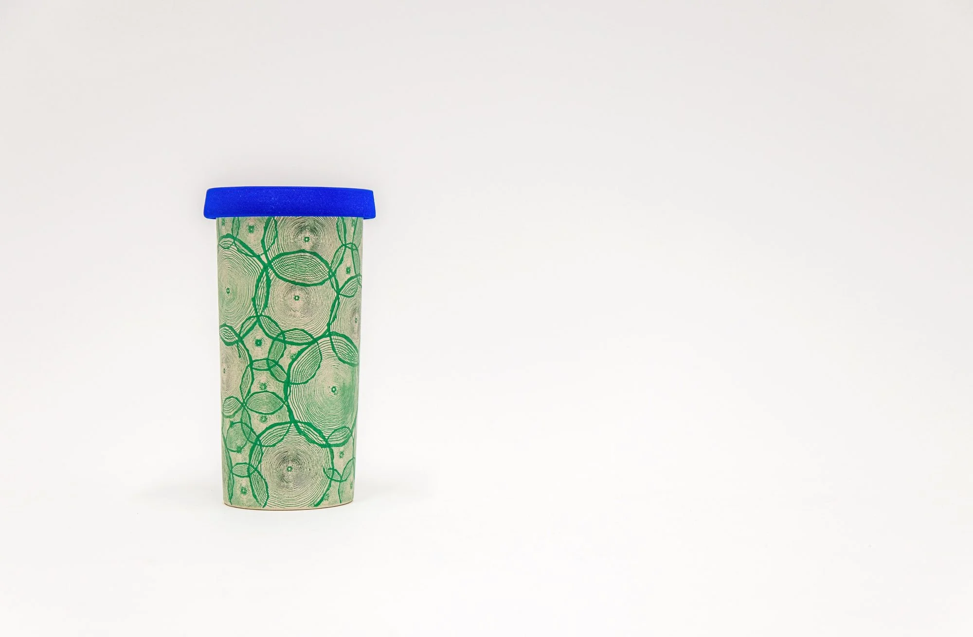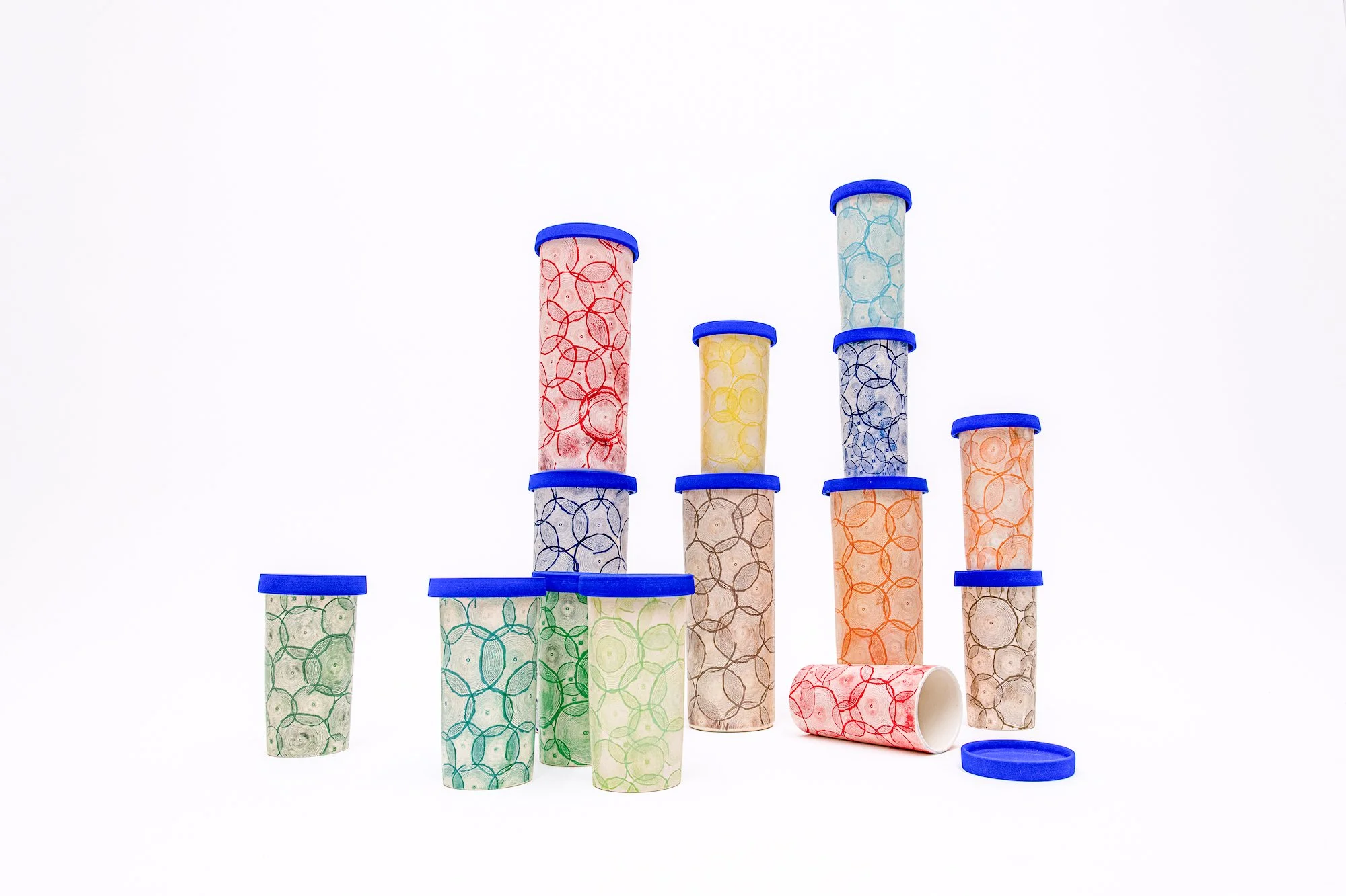These cylindrical shaped vases - recalling tree trunks - is made up of an array of stamped tree ring patterns accumulated on its surface.